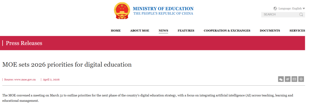 4月6日,教育部在官方英文网站发布新闻稿《MOE sets 2026 priorities for digital education》,向国际社会系统阐述中国"十五五"数字教育战略的六大优先方向。发布时间紧接3月31日国内部署会议,但这不是一次普通的政策翻译——主动选择英文、主动面向全球受众,这个动作本身已说明问题:中国教育数字化进入了主动对外讲述的阶段。